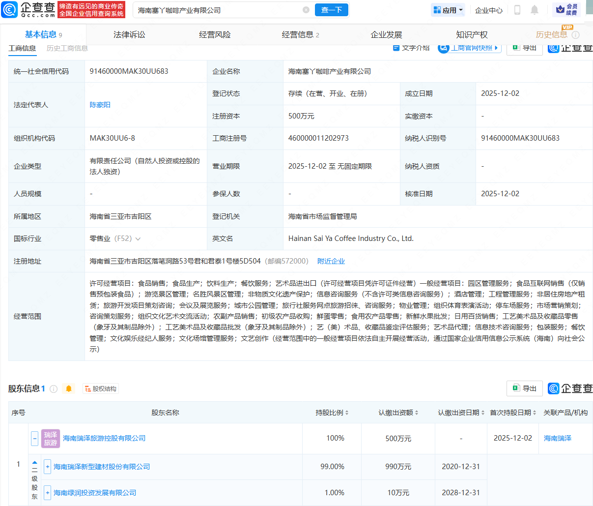 近日诚信双盈配资,海南塞丫咖啡产业有限公司成立,法定代表人为陈豪阳,经营范围包含:食品销售;食品生产;饮料生产;餐饮服务;游览景区管理;名胜风景区管理;非物质文化遗产保护等。企查查股权穿透显示,该公司由海南瑞泽(002596)旗下海南瑞泽旅游控股有限公司全资持股。